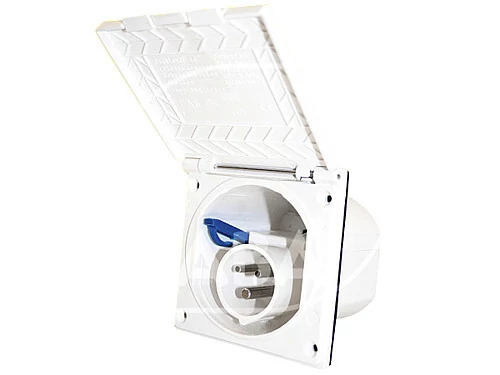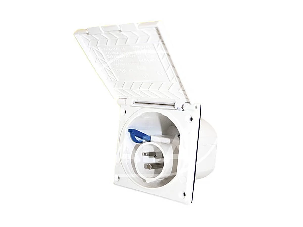Kis változat lehajtható fedéllel. A fedél és a hátsó fedél háza húzásgátlóval és fali tömítéssel van ellátva, így fröccsenő víz ellen védett.CEE17, külső fedeles betáp, fehér, 104 x 104 x 81 mm.