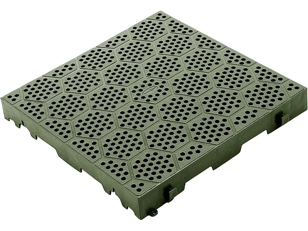 Ez a kültéri padlótábla különleges jellege miatt lehetővé teszi a víz áramlását és az elektromos kábelek lerakását. Kifejezetten stabil. A teljesen perforált felület optimális szellőztetést biztosít az alatta lévő talajnak és megakadályozza a víz visszatartást. A kialakítás és szín díszítő alaprajzok létrehozását is lehetővé teszi. Gyors és egyszerű telepítés a praktikus csatlakozóhorgoknak köszönhetően. Kétféle színben is kapható. Méretek 38,5 x 5,5 x 38,5 cm (Sz x M x Mé). Súly 1,2 kg.