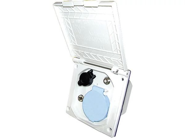Többfunkciós külső fedeles csatlakozó fehér színben. (230 V/12 V/TV/TV-műhold). IP44 védettségi osztály.