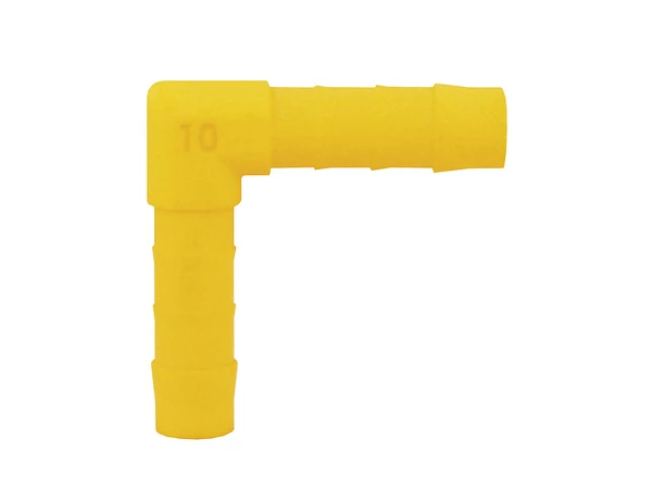 Vízcső összekötő elem, derékszögű, 4,5 x 4,5 cm, 10 mm átmérővel, sárga.