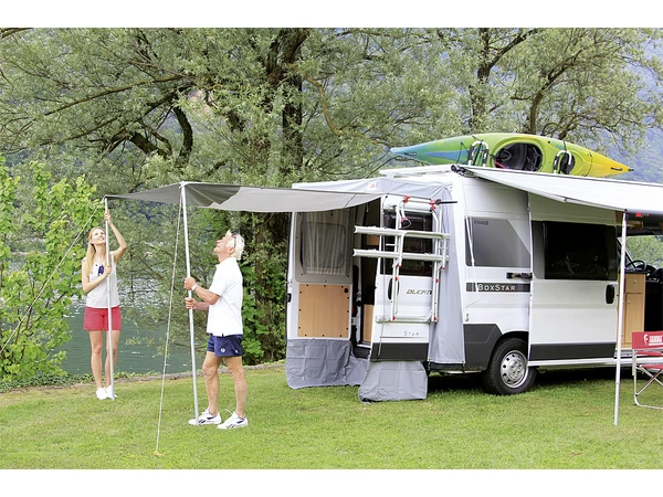 Innovatív napárnyékoló megoldás feltekerhető homlokfallal. A kinyíló hátsó ajtókhoz rögzíthető a 2006 utáni Ducato, Jumper, Boxer modellek esetében, továbbá a Mercedes Sprinter (2006-2008) típusnál. Néhány perc alatt feltehető és lerögzíthető az alu-rudazat és a dupla kédersín segítségével. Teljesen lezárható, ezáltal jelentősen megnövelve a belső teret.