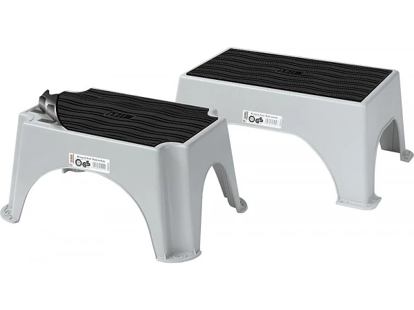Gumiszőnyeg megkönnyíti az 500 x 340 x 220 mm méretű egylépcsős műanyag fellépő biztonságos használatát.