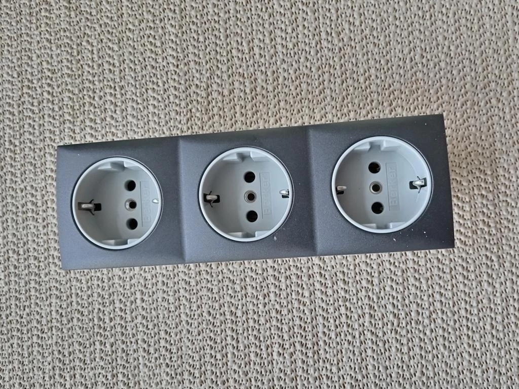 Hármas fekete színű keretbe ágyazott szürke konnektor.