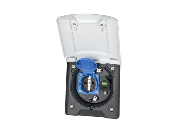 Kültéri fedeles, többfunkciós külső csatlakozó ezüst színben. (dupla USB/230 V/12 V/HDM/SAT). IP44 Freccsenő víz ellen védett.
