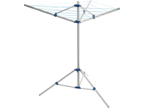 Laun-Tree 3A alumínium rotációs ruhaszárító állvány, 150 cm magas. Stabil, háromlábú, összecsukható. Szélessége 130 cm, központi cső 40 mm átmérőjű. Bárhol felállítható, kültéren és beltéren is használható. Súlya: 2,3 kg.