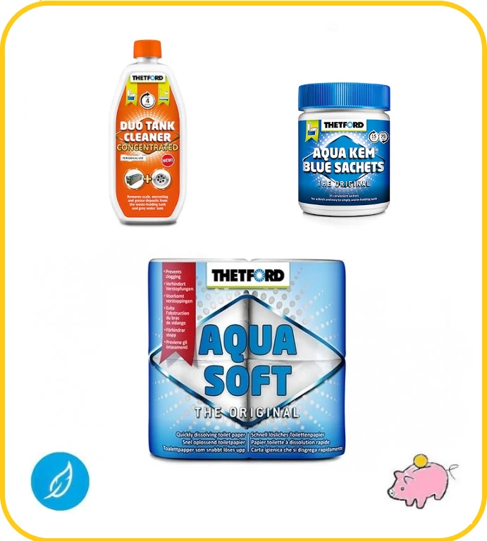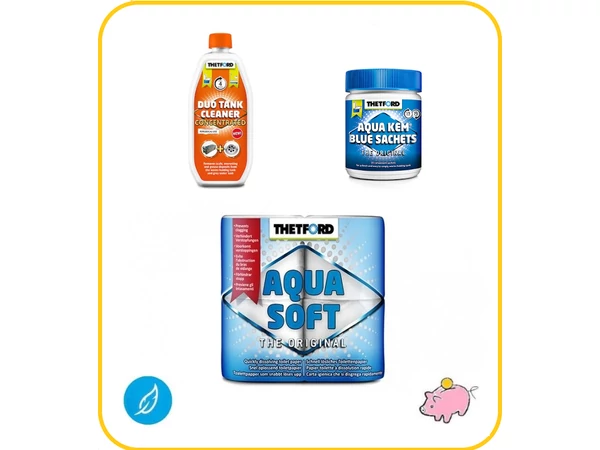 A csomag alapját az Aqua Kem Sachet jelenti, mely vásárlóink egyik kedvence: 15 előre kiporciózott adagot tartalmaz, és rendkívül egyszerűen használható. Az Aqua Soft toalettpapír a lebontószer hatására teljesen lebomlik, így nem tömíti el a kiöntőcsonkot és nem károsítja a gumitömítést, nem tapad a toalett belső falára, továbbá higiénikusan használható, hiszen a hagyományos vécépapírral ellentétben a fekáliatartályba dobható. A Duo Tank Cleaner közömbösíti a szürke vizet, hatásosan oldja fel a tartály falán lévő vízkövet és egyéb lerakódásokat, hosszú időre semlegesíti a kellemetlen szagokat.
