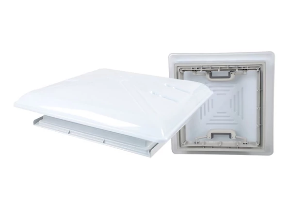 MPK 46, víztiszta fényáteresztő tetőszellőző fedél . 400 x 400 mm. A tetőborítás túlnyúlik a beépítendő kereten, így a karimájának köszönhetően jobban elvezeti a csapadékot. A belső fogantyú színe szürke.