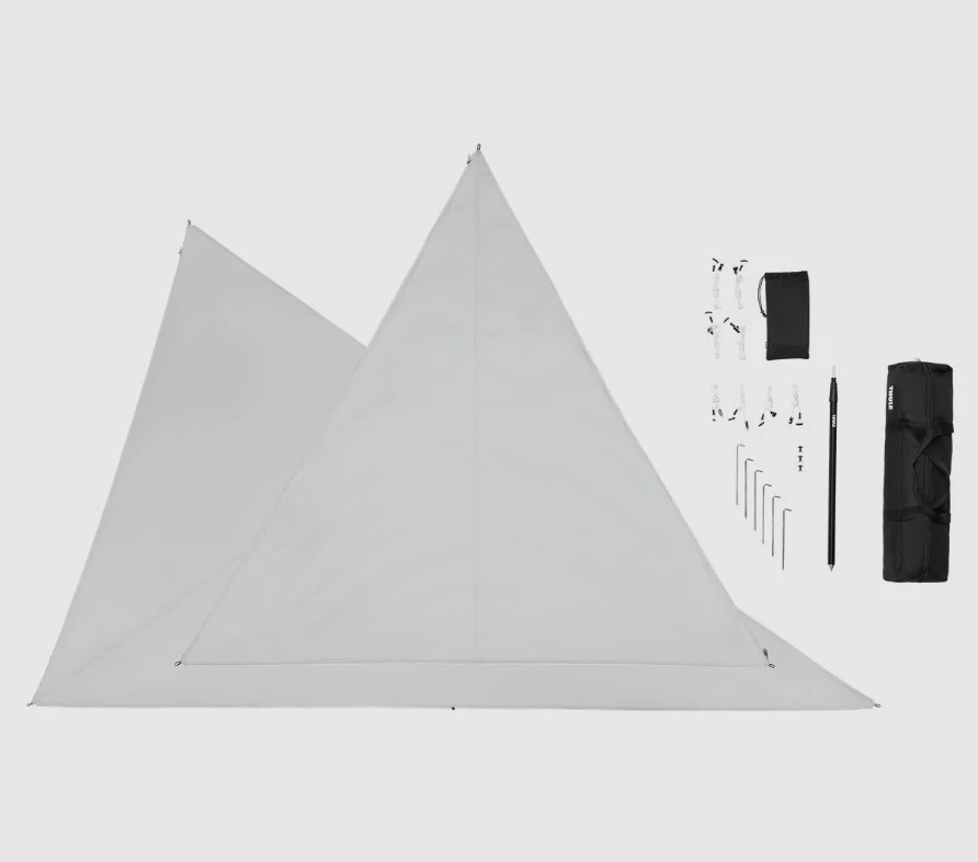 A Thule napvitorlák légáteresztő, vízálló anyagból készültek, az eső és az UV-sugárzás ellen is védelmet nyújtanak. A háromszög alakú panelek különböző módokon kombinálhatók, így egyszerűen módosíthatja a napvitorla beállítását a nap helyzetéhez mérten. A felszerelés egyszerű: csak bele kell csúsztatni a paneleket a kazetta vezetősínjébe, majd az állítható tartórúd segítségével állítsa az Önnek megfelelő pozícióba.