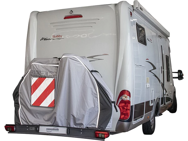 Az új PROFESSIONAL kerékpárvédő huzatot kifejezetten legfeljebb 2 kerékpár védelmére fejlesztették ki, amelyeket a lakóautó hátfali tartóján szállítanak. A zárt védőburkolatot felülről húzzuk a kerékpárokra, és körös-körül zárjuk. Annak érdekében, hogy a kerékpárokat a védőburkolat felhelyezése után könnyen le lehessen venni és újra fel lehessen állítani, a burkolat egy méretes zárófedelet kapott, amely a (fényvisszaverő) cipzárak segítségével nyitható. A PROFESSIONAL kerékpárvédő huzatot ezért nem kell minden alkalommal eltávolítani, a tartón maradhat. Az alsó részének közepén egy erősen bekötött kb.80 cm széles fenéklap található, mely felfröccsenés elleni védelemként szolgál. Az alsó szegély menti élterületeken a burkolat nincs lezárva a könnyebb kezelhetőség érdekében. Az alsó peremnél jobb és bal oldalon 1-1 rugalmas szalag található, amely szorosan meghúzva megfelelő tömítést tesz lehetővé. Kívül 2-2 pánt található jobb és bal oldalon, és 1-1 pánt a tetején a burkolat megfeszítéséhez. Ezért nincs szükség további feszítő hevederekre!