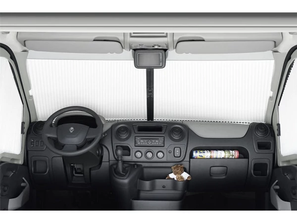 Vezetőfülke ablak sötétítő roló RemiFront IV Fiat Ducato X290 extra csomaggal 2014-től bézs színben plisszé rolóval. Kinyitott állapotban teljesen szabad kilátás. A